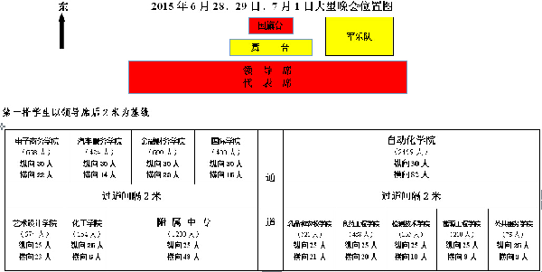 1、按照学校2015年6月28、29日及7月1日晚8:00正式演出的要求,各二级学院、附属中专的2013、2014级全体学生必须统一穿校服,自带凳子,在7:30前准时集合队伍参加。演出期间各二级学院、附属中专分管学生领导、学生科科长、干事、辅导员班主任维持好现场秩序,演出期间不准学生随意走动,保持肃静,不准做与演出无关的事情。如果人数出入不大,请横向解决,务必保证纵向人数,各部门留好通道。
