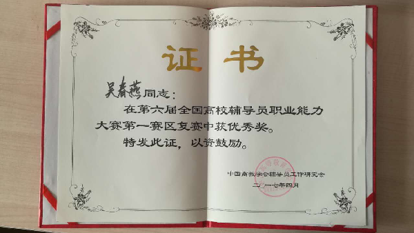 本次比赛获得校领导和学生工作处的大力支持,不仅安排有参赛经验丰富的辅导员专门指导,还时刻关注比赛进程,关心和鼓励参赛选手。吴春燕老师也在比赛中进一步加深了对辅导员工作的认识,对辅导员教师和管理者双重身份以及思想政治工作重要性又有了进一步的认识。她表示,一定会把参赛时的拼搏精神体现在今后的点滴工作中,时刻严格要求自己,做一名光荣的辅导员。